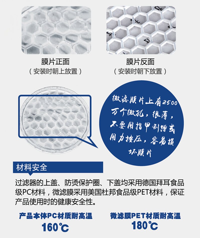 清华大学最新专利技术制造的优化流道设计的新型核孔滤膜在保留传统孔滤膜所有优点的基础上,极大提高了单位面积膜的过滤液体速度及抗染能力,使之能够在极低压力下过滤大量液体,使核孔膜这种以往只能应用于高端科技领域的产品为百姓服务成为可能。