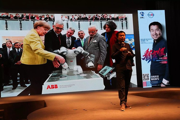 ABB的这个产品叫协作机器人,就是人和机器之间可以协同工作,它有了感知,有了数据,有了后台,这是一种全新的工业方式。这是默克尔总理和印度总理跟我们参与设计的,对这个机器人进行交互。